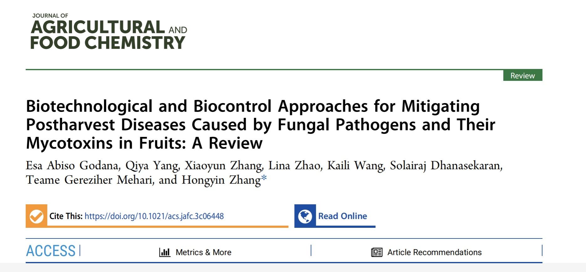 近日,yl9193永利集团张红印教授在Journal of Agricultural and Food Chemistry(中科院一区)发表题为“Biotechnological and Biocontrol Approaches for Mitigating Postharvest Diseases Caused by Fungal Pathogens and Their Mycotoxins in Fruits”的综述论文(https://doi.org/10.1021/acs.jafc.3c06448),系统阐述了拮抗性酵母菌、细菌和真菌等生防治剂在植物病害防治中应用的最新研究进展。永利集团博士后Esa Abiso Godana为第一作者,张红印教授为本文的通讯作者。