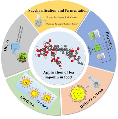 油茶在中国分布广泛,2020年产量约314万吨。油茶籽饼是油茶产业的副产品,约占油茶籽的50%。中国每年生产约200万吨油茶籽饼,但大多数都未得到充分利用,一般作为工业废弃物丢弃,造成资源浪费。油茶籽饼中含有大量的茶皂素,由于其独特的性质和潜在的应用价值,近年来受到了相当大的关注。茶皂素具有多种药理作用,是一种优良的非离子表面活性剂。天然表面活性剂的开发已成为食品研究的热点。因此,该论文综述了茶皂素作为表面活性剂在食品中的应用,重点介绍了茶皂素在乳液、递送系统、提取和发酵等方面的应用,以及在食品应用中面临的挑战和发展前景,旨在提高油茶籽加工残渣的综合利用价值,促进油茶产业的健康可持续发展。