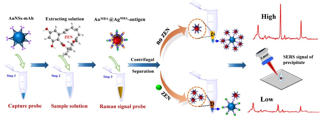 论文以ZEN抗原修饰的双层信号分子标记的核壳纳米粒子(AuMBA@AgMBA)作为信号探针(卫星),以ZEN抗体修饰的金纳米星(AuNSs)作为捕获探针(核),通过核-卫星的自组装建立了ZEN的SERS检测方法。该方法中,双层信号分子标记提高了SERS信号的强度和稳定性,多尖端的金纳米星结构提供更多SERS“热点”,形成的组装体可以产生更强的拉曼信号,从而实现了ZEN的高灵敏检测。