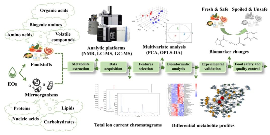 图2 利用非靶向代谢组学描绘封装的精油影响下食品和微生物代谢谱