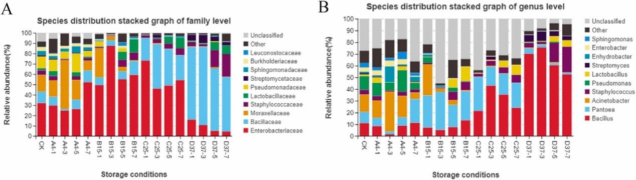 微生物的快速生长以及微生物菌群演替是生鲜面贮藏的显著特征之一,导致生鲜面的优势腐败菌随温度的变化而存在差异。研究发现生鲜面中属水平微生物菌群演替规律为:由不动杆菌属(4 ℃)转变为泛生菌属和芽孢杆菌属(15 ℃),再到芽孢杆菌属和泛生菌属(25 ℃),最后到芽孢杆菌属和葡萄球菌属(37 ℃)。对生鲜面中优势菌株的分离鉴定,在种水平上也表现出相似的进化过程。鉴于优势菌的差异对面条保质期的影响,我们设计了一种新策略,通过准确定位靶标菌株来开发生鲜面保鲜剂。