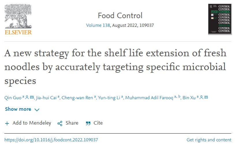近日,yl9193永利集团徐斌教授在Food Control在线发表题为“A new strategy for the shelf life extension of fresh noodles by accurately targeting specific microbial species”,首次针对生鲜面中优势靶标菌株开发出新型保鲜剂。采用该方法可以提高生鲜面的保鲜准确性和保鲜效率。永利集团郭钦副教授为第一作者,永利集团徐斌教授和郭钦副教授为共同通讯作者。