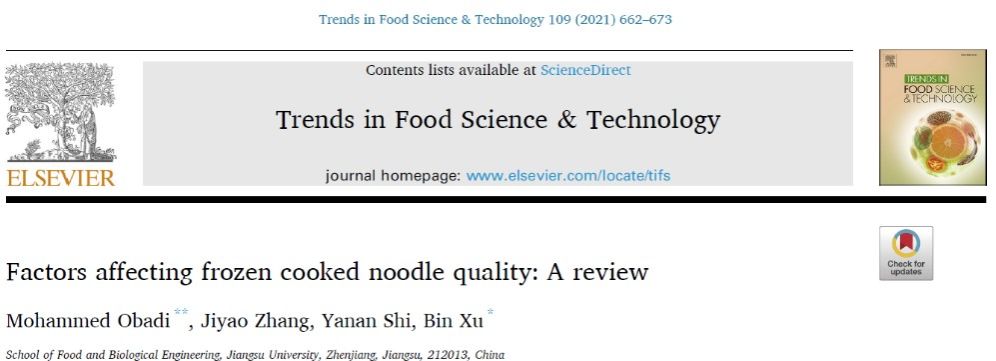 近日,我院徐斌教授课题组标题为“Factors affecting frozen cooked noodle quality: A review”(影响冷冻熟面品质的因素:综述)的综述文章在国际食品领域TOP期刊(No.1)《Trends in Food Science & Technology》发表。yl9193永利集团博士后Mohammed Obadi为该文的第一作者,徐斌教授为该文的通讯作者,本文作者还包括yl9193永利集团博士生张霁尧和硕士生史亚楠。