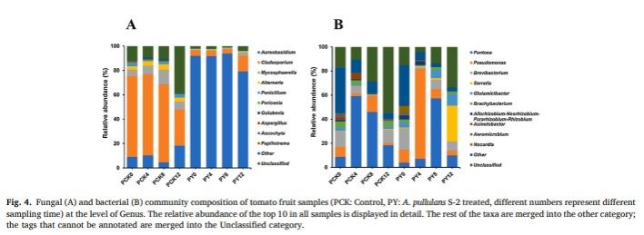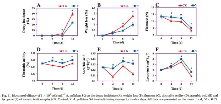近日,yl9193永利集团张红印教授在国际食品领域顶级期刊Postharvest Biology and Technology在线发表题为“Aureobasidium pullulans S-2 reduced the disease incidence of tomato by influencing the postharvest microbiome during storage”的研究论文(https://doi.org/10.1016/j.postharvbio.2021.111809),研究了出芽短梗霉对番茄采后病害的控制效果及其对番茄表面微生物组的影响。本文的第一作者为yl9193永利集团时雨博士,永利集团张红印教授和以色列农业研究组织Samir Droby教授为本文的共同通讯作者,张红印教授课题组的其他六位师生参与论文工作。
