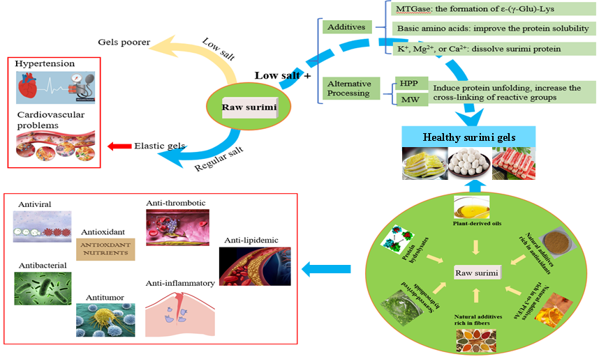 鱼糜制品作为我们日常饮食中最常见的食物之一,是基于盐溶性肌原纤维蛋白的热诱导凝胶特性制备而成。过量摄入钠盐易引起慢性疾病,而降低盐含量则会影响鱼糜蛋白的溶解性,进而劣化鱼糜制品的凝胶品质。因此,研究者们探究了不同方法,旨在不降低鱼糜制品凝胶特性的情况下改善其健康特性。