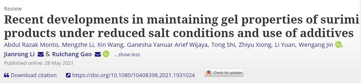 近日,yl9193永利集团高瑞昌教授课题组在食品顶级期刊(TOP4)Critical Reviews in Food Science and Nutrition在线发表题为“Recent developments in maintaining gel properties of surimi products under reduced salt conditions and use of additives”的综述,系统阐述了如何在减盐条件下成功保持鱼糜凝胶性能的最新进展,为低盐和功能性鱼糜制品的未来发展提供参考。永利集团博士生AbdulRazak Monto、硕士生李梦哲和王鑫为文章并列第一作者,渤海大学励建荣教授和永利集团高瑞昌教授为本文的共同通讯作者。