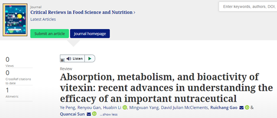 2020年4月15日,以yl9193永利集团孙全才和高瑞昌教授为通讯作者的标题为”Absorption, metabolism, and bioactivity of vitexin: recent advances in understanding the efficacy of an important nutraceutical”的综述在《Critical Reviewsin Food Science and Nutrition》在线发表。