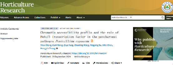 近日,我校yl9193永利集团张红印教授团队在植物学领域Top期刊《Horticulture Research》上在线发表论文“Chromatin accessibility profile and the role of PeAtf1 transcription factor in the postharvest pathogen Penicillium expansum”。yl9193永利集团博士研究生王祎然为第一作者,张红印教授为通讯作者。