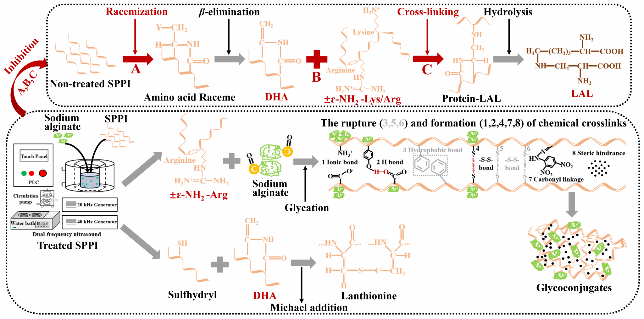 该研究利用海藻酸钠多糖和超声的联合手段抑制赖丙氨酸的生成并揭示其抑制机理。研究发现,超声促进了蚕蛹蛋白精氨酸侧链氨基与海藻酸钠羰基间的缩合反应,且通过蛋白与多糖的氧化氨基酸聚合、静电结合、氢键键合和g-g-g二硫键等交联,形成具有高粗糙度的大分子聚集体结构,增加整个体系的粘度和立体位阻效应,从而限制了包括赖氨酸、丝氨酸、半胱氨酸和苏氨酸在内的一些前体氨基酸的降解和赖丙氨酸交联反应的发生。