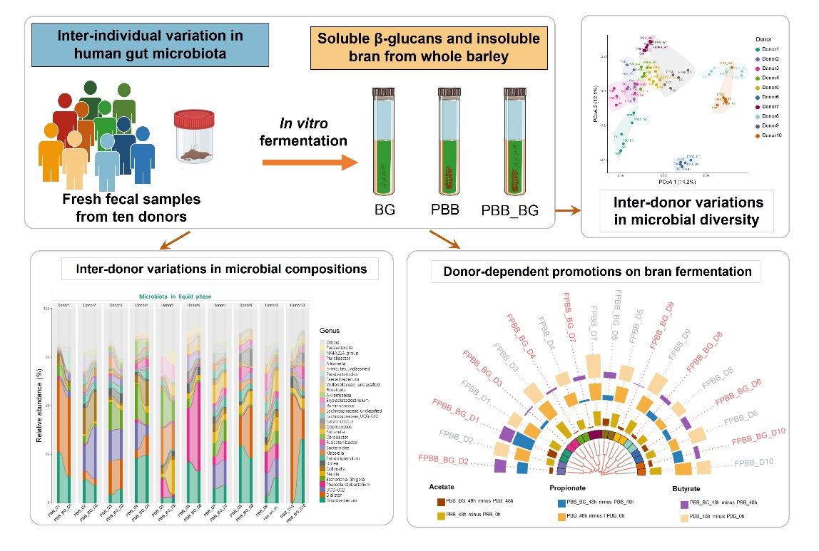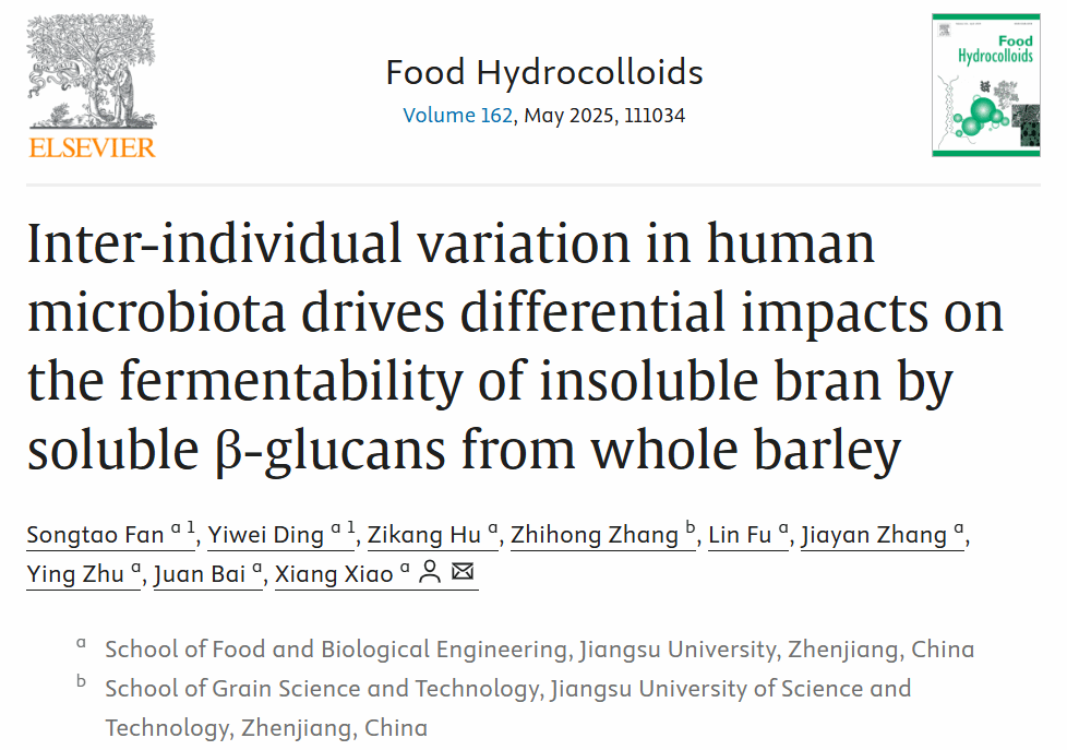 近日,我院肖香教授、范松涛讲师在在国际Top期刊《Food Hydrocolloids》(Q1,IF2023:11.0)上发表论文“Inter-individual variation in human microbiota drives differential impacts on the fermentability of insoluble bran by soluble β-glucans from whole barley”。永利集团为第一完成单位,食生学院范松涛讲师和22级硕士研究生丁怡炜为该文共同第一作者,肖香教授为该文通讯作者。