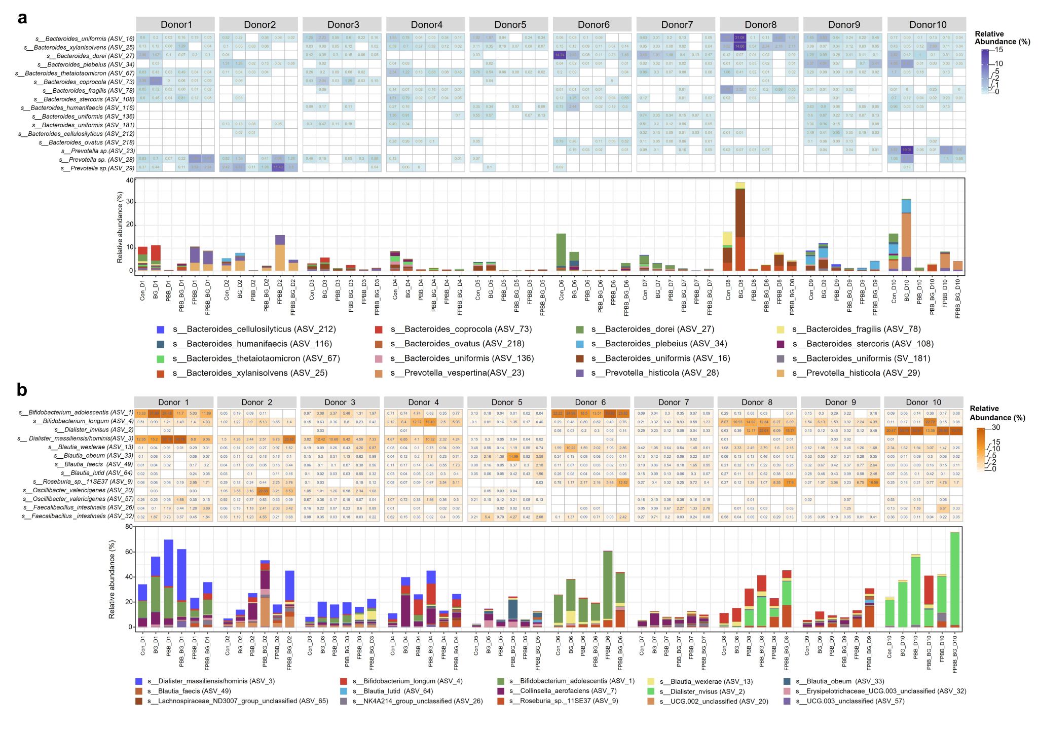 研究结果显示,在不同结构的健康肠道菌群中,BG和PBB_BG的pH值在酵解12 h内急剧下降,同时乙酸含量显著增加,而PBB组和Con组的pH值变化趋势相似。这说明可溶BG能够被各种健康肠道菌群结构快速降解,且不可溶PBB的存在对BG降解无明显影响。 在酵解48h,与BG或PBB相比,PBB_BG明显增加丙酸盐和丁酸盐的产量,并在10位志愿者中有8名和10名分别显示出丙酸和丁酸的最高含量。值得注意的是,BG特异性地增加志愿者1、2和10中的丙酸和丁酸产量。通过扩增子测序分析液体培养基和麸皮附着微生物群,发现在不同肠道菌群结构中,BG均能选择性促进液体培养基中不同Bacteroides spp. 生长。在志愿者1、2和10中,BG特异性地抑制麸皮附着 Prevotella spp.生长,并以个体依赖的方式促进产丁酸菌和产丙酸菌在麸皮表面定植。 这些结果表明,快酵解β-葡聚糖以个体依赖的方式促进慢酵解麸皮纤维的肠道酵解,强调了全谷物干预中肠道菌群个性化反应的重要性,为开发基于肠道菌群的个性化膳食纤维干预策略提供理论基础和试验依据。