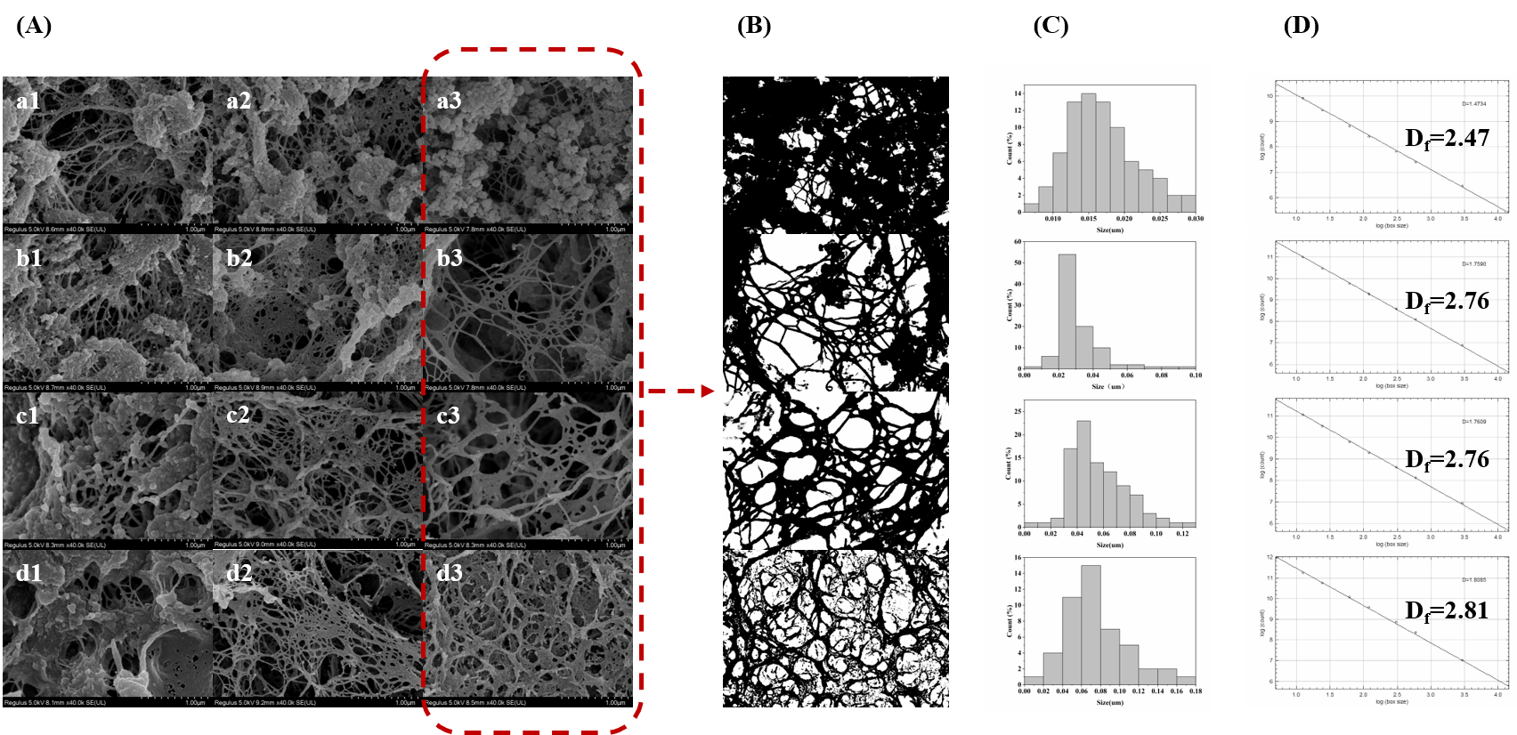 图2 低盐鱼糜凝胶的扫描电子显微镜照片(×40000)。(A)是SEM图像,(B)是二值化图像,(C)是蛋白质网丝直径分布,(D)是分形维数