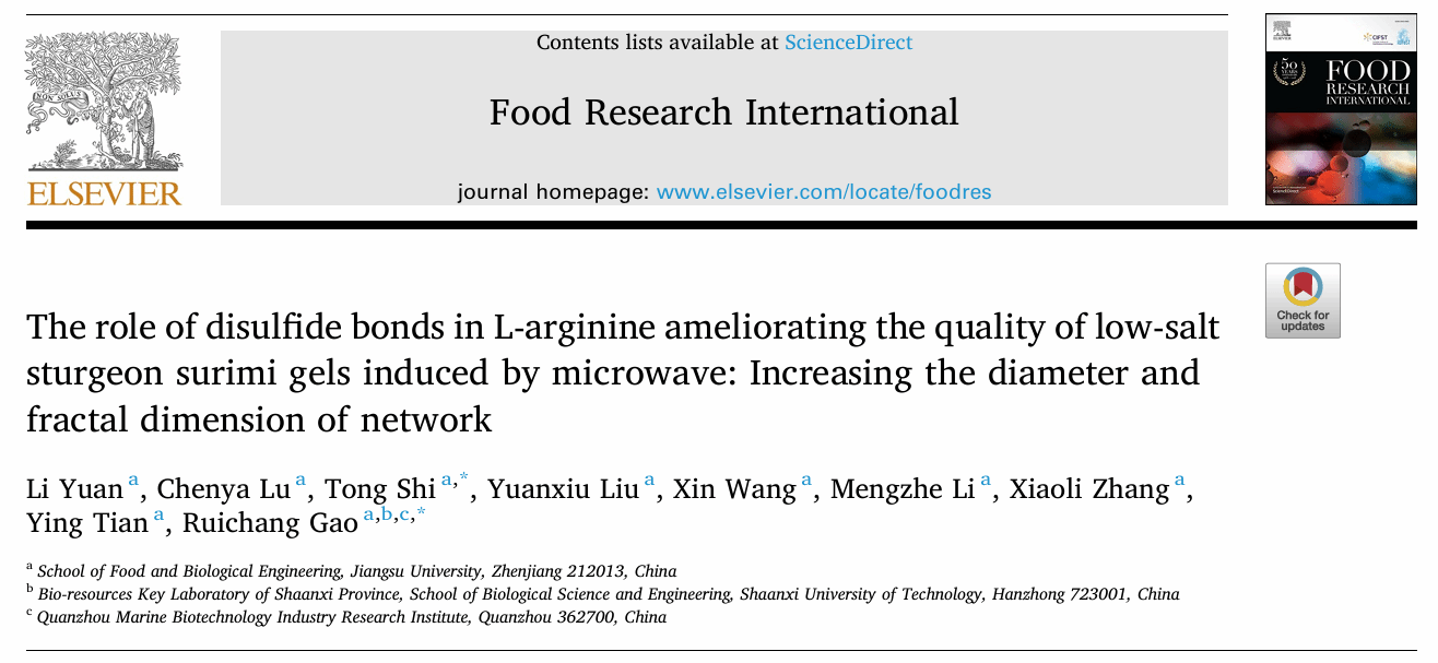 2025年2月,我院高瑞昌教授团队在国际期刊《Food Research International》(Q1,IF2025=7.0)上发表主题为“The role of disulfide bonds in L-arginine ameliorating the quality of low-salt sturgeon surimi gels induced by microwave: increasing the diameter and fractal dimension of network”的研究型论文。永利集团食品学院高瑞昌教授、石彤实验师为本文通讯作者。