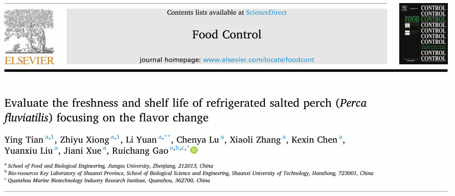 2025年4月永利集团高瑞昌教授团队在国际期刊《Food Control》(Q1,IF2025=5.6)上发表题目为“Evaluate the freshness and shelf life of refrigerated salted perch (Perca fluviatilis) focusing on the flavor change”的研究型论文。永利集团食品学院高瑞昌教授、袁丽教授为本文通讯作者。