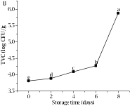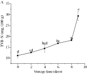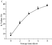 图1 冷藏过程中盐渍鲈鱼的挥发性盐基氮含量(A)、菌落总数(B)和K值(C)的变化