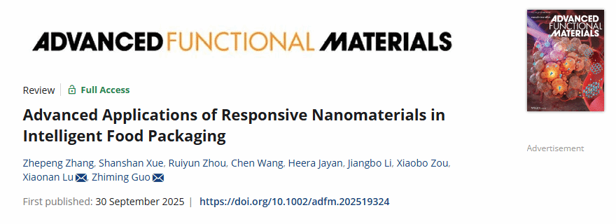 近日,我院郭志明教授团队在国际Top期刊《Advanced Functional Materials》(Q1,IF2024: 19)上发表论文“Advanced Applications of Responsive Nanomaterials in Intelligent Food Packaging”。博士研究生张浙鹏为第一作者,永利集团郭志明教授和加拿大麦吉尔大学Xiaonan Lu教授为共同通讯作者。