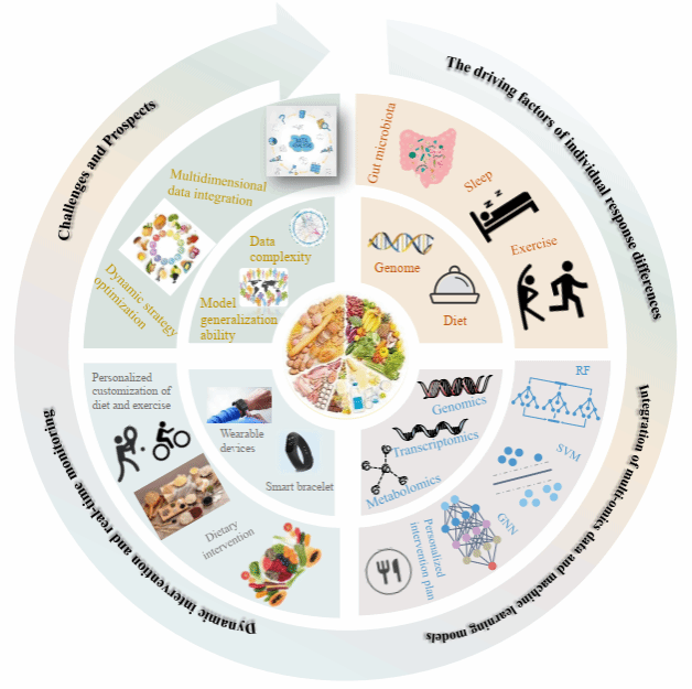 营养干预旨在通过膳食调整改善健康,但其效果受个体遗传背景、肠道菌群及生活方式差异的影响而呈现高度异质性。多组学与机器学习研究揭示,个体对同一饮食结构的餐后血糖反应差异巨大,其根源在于上述因素的复杂互作。因此,精准预测营养干预措施对血糖、血脂等核心指标的影响,成为当前研究的焦点。机器学习模型已能通过分析个体数据预测血糖波动并识别关键营养功能因子,为实现个性化饮食干预提供了科学依据。总体而言,本综述系统总结了机器学习与组学技术融合的研究现状,并展望了其在食品组学与营养组学领域的未来发展方向。