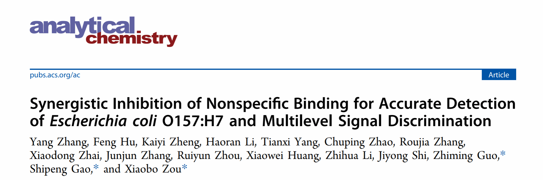 近日,永利集团邹小波教授课题组在国际食品领域TOP期刊Analytical Chemistry上发表题为“Synergistic Inhibition of Nonspecific Binding for Accurate Detection of Escherichia coli O157:H7 and Multilevel Signal Discrimination”的研究论文。我院硕士生导师张钖为该论文的第一作者,其学生胡凤为二作,邹小波教授、郭志明教授和高士鹏副教授为该文的通讯作者。