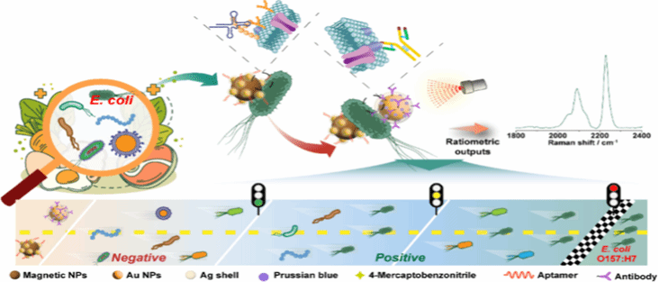 本研究开发了一种基于等离子体纳米结构的新型生物传感器,用于食品中 大肠杆菌O157:H7的高特异性检测。通过在纳米粒子表面功能化靶向大肠杆菌 O157:H7 两个不同表位的识别元件,并整合静默区拉曼信号分子实现比率信号输出,最后结合磁富集技术提高选择性。该研究首次定量表征和归一化各类非目标菌株的干扰水平,建立明确的信号阈值,有效区分真阳性与假阳性信号。创新性地解决了现有生物传感器在区分亲缘关系密切的大肠杆菌菌株方面的关键局限性,为食品安全领域的病原体监测工作,提供了一种极具应用前景的诊断工具。