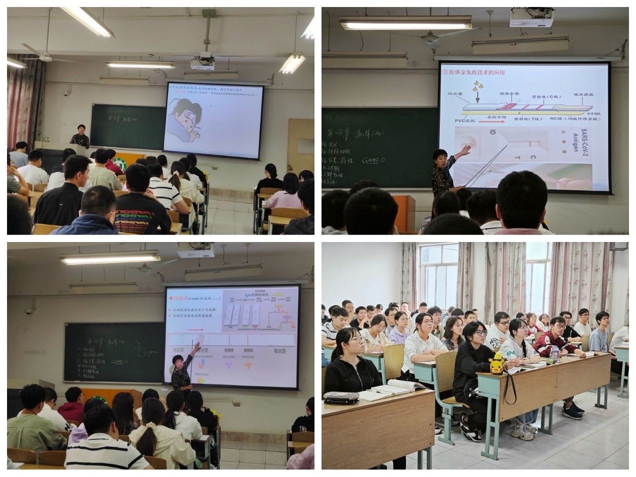 课上,蔡梅红老师在简单回顾上节课堂讲授的抗体的免疫学应用(免疫荧光技术、酶联免疫吸附技术、免疫放射技术)内容基础上,引出本节公开课的新内容—免疫胶体金技术。蔡老师结合我们刚刚经历过的新冠病毒疫情,运用了2022年永利集团优秀教学案例《居家也知“阳没阳”新冠病毒抗原测试纸的原理及应用》,生动并深刻地讲解了胶体金的定义、免疫胶体金技术的应用特点及应用三部分内容。在深入浅出讲解专业知识的同时,生物技术专业广阔前景、勇于专业探索等思政内容设计方面也自然流畅,不刻板生硬,易于接受,在实现有效知识传授的同时,也促进了专业素养的培养。本次课堂设计、课堂互动、教学效果均得到了同学们和观摩教师的一致称赞。