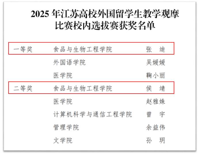 经过专家评审,张迪老师荣获本科理工组一等奖,侯婧老师获得二等奖,两位教师均被推荐参加2024年江苏高校外国留学生教学观摩比赛省级赛事,展现了食生学院在国际化教学领域的综合实力和教师队伍的专业素养。