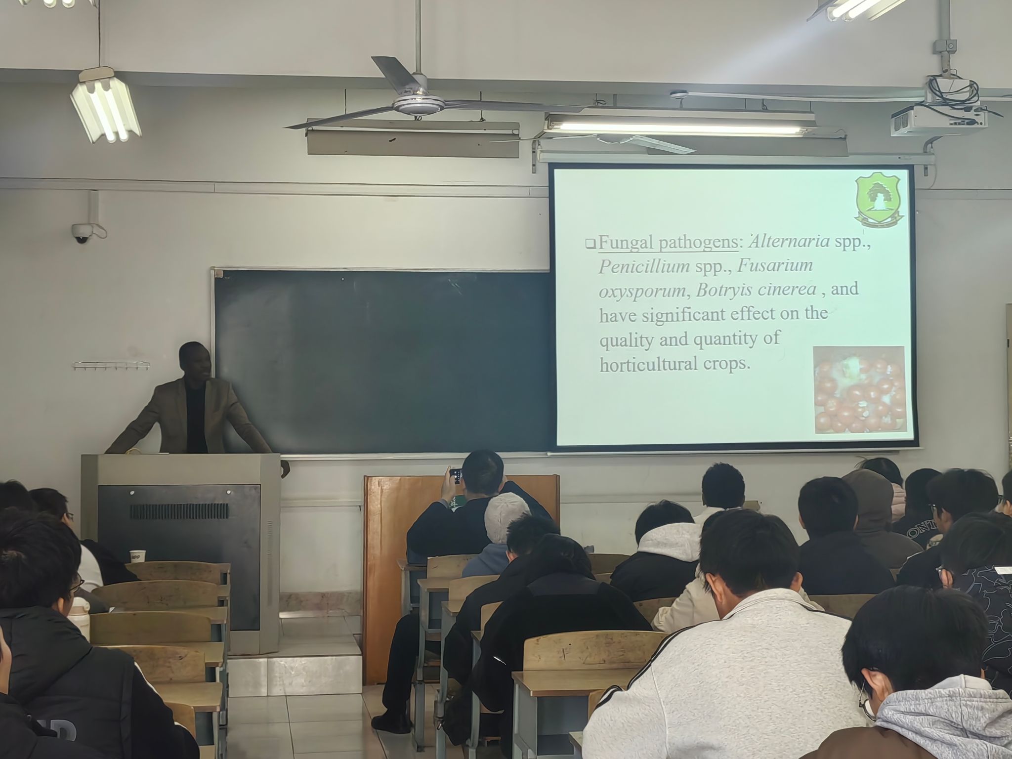 Gustav Mahunu博士首先介绍了加纳果蔬采后病害的现状和面临的问题,生物防治的重要性和工业干燥的分类。之后,重点讲述了生物防治作为重要的控制方法在加纳果蔬采后病害控制中的应用研究。本次专家报告内容生动丰富,深入浅出,通俗易懂,引人入胜。报告结束后,专家与参会师生进行了气氛热烈的讨论。