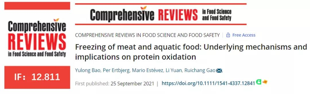 近日,我院高瑞昌教授水产科学与健康创新课题组标题为“Freezing of meat and aquatic food: Underlying mechanisms and implications on protein oxidation”的综述文章在国际食品领域TOP期刊《Comprehensive Reviews in Food Science and Food Safety》(IF:12.811)在线发表(https://doi.org/10.1111/1541-4337.12841)。