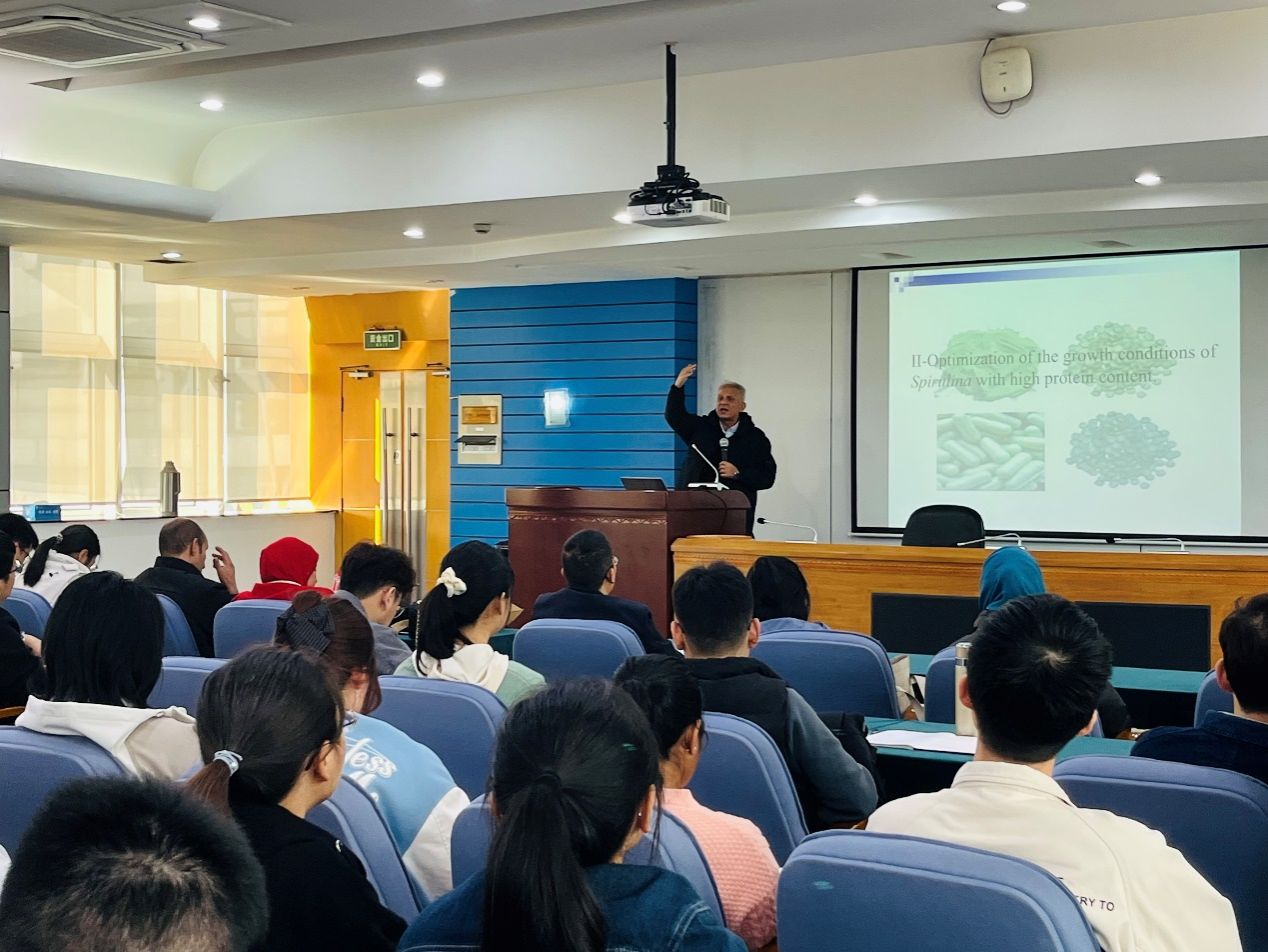在专题报告中,El-Sheekh教授聚焦螺旋藻与小球藻两大核心藻种,深入阐释其在水产饲料中的应用价值。他介绍,螺旋藻蛋白质含量高达60%—71%,必需氨基酸组成符合联合国粮农组织标准,而小球藻则以高生物量产率和丰富叶绿素成为理想单细胞蛋白来源,二者均具备替代传统鱼粉的巨大潜力。结合团队多年研究成果,教授重点分享了微藻饲料在红罗非鱼养殖中的实证数据:在饲料中添加适宜比例的微藻干粉,可使罗非鱼幼鱼生长速率提升18%,饲料转化率提高22%,同时显著增强鱼体免疫酶活性。这一发现与罗非鱼作为优质高蛋白水产品的特性形成协同——罗非鱼富含谷氨酸、甘氨酸等人体必需氨基酸,微藻饲料的应用可进一步提升其营养价值与商品价值。针对微藻资源的多维度开发,El-Sheekh教授展示了团队的创新成果:在食品领域,通过绿色提取技术获得的藻胆蛋白已应用于功能性食品开发;在农业领域,藻基肥料可使作物根系活力提升30%,且能减少化肥使用量25%;而在环保领域,蓝藻固氮技术为水体富营养化治理提供了新路径。他特别强调:“微藻的规模化应用需突破成本瓶颈,我们已建立‘光生物反应器+废水培养’双系统,使藻种生产成本降低40%,这为产业化推广奠定了基础。”报告后的互动环节,师生围绕微藻饲料添加比例优化、藻种抗污染选育等问题展开热烈讨论。周存山教授结合自身在生物质绿色催化转化领域的研究经验补充道:“我院在超声辅助提取、离子液催化等技术上的积累,可与教授团队的藻种开发形成技术互补,有望在微藻高值化利用上实现突破。”