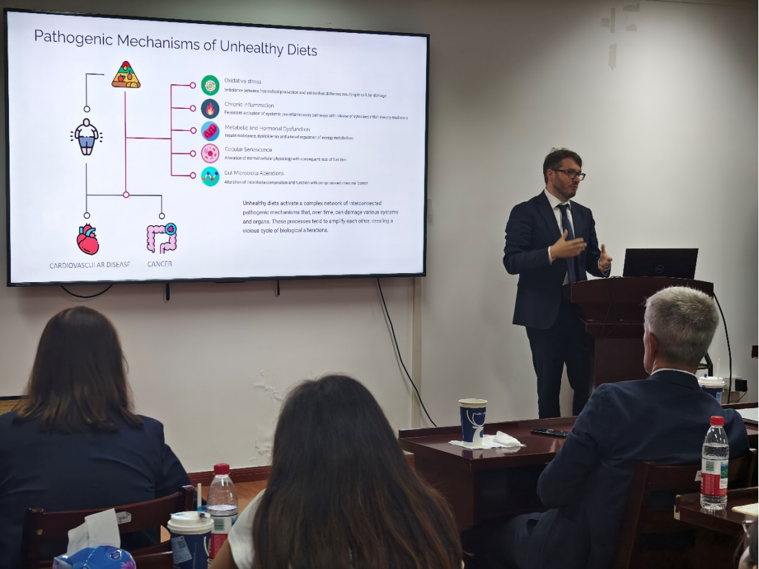2025年7月30日,意大利卡塔尼亚大学(University of Catania)人类营养学教授、欧洲公共卫生协会食品与营养部门主席Giuseppe Grosso博士应邀作题为“膳食多酚与大脑健康”的学术报告。yl9193永利集团师生代表参加了此次报告会。